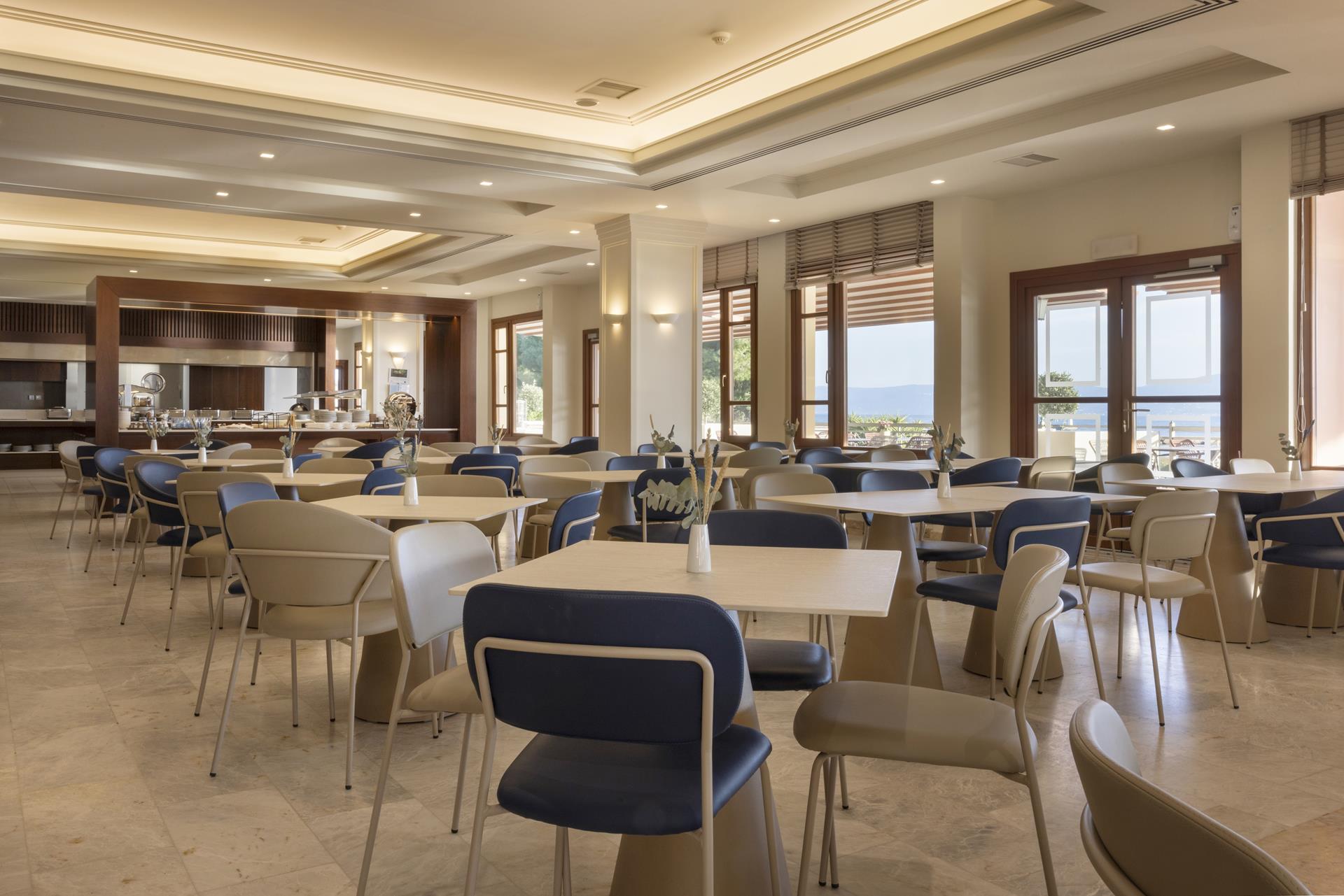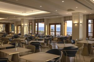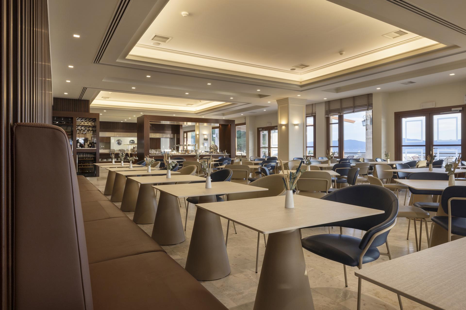 Le restaurant Levante, avec sa grande véranda, est situé au premier étage de l’hôtel et offre une vue panoramique sur le golfe d’Eubée, la plage avec les arbres à mastic, la piscine et la forêt de pins.